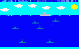 Die C128 Variante von U-Boot Jagd (das Original ist ein Programm für den CBM 4008) läuft auf dem 80-Zeichen Bildschirm (VDC) des C128 und hat etwas zusätzliche Farbe erhalten. Das ist aber auch das einzig besondere an diesem sonst recht simplen Spiel. |