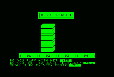 The very first version has been a PET/CBM game [distichon 4001]. It has been reworked and extended for the C64 in 2009 due to the 4k programming competition at Forum64 [distichon 1.0]. To fill the 4k a platform detection has been added, too. The Forum64 version had some limitations due to the competition rules. E.g. the lower case charset problem of the original pet 2001 with reversed shifted and unshifted alpha and the switch of a cbm 8001 series computer to a 40 column screen. Both problems need some assembler programming which have not been allowed for the competition. Both problems have been solved now. You can play Distichon on the following systems (all will be identified by the program): PET 2001; CBM 3001 (PET 2001 with upgrade ROMs); CBM 4001; CBM 8001; C16,C116,Plus4; P500 (CBM 510); C64; C128 (40 columns) There is no support for the CBM 6x0 and 7x0 models, due to the 80 column screens. There is also no support for the VIC 20 because the screen width is much too small. Did i forget something? Oh, yes, the KIM 1 has no screen at all. ;-) Due to the fact that the old CBM computers do not have a relocating loader, all BASIC programs have been saved with starting address $0401. Therefore, the program has to be loaded e.g. on a c64 with load"start distichon",8 run and not with load"start distichon",8,1 ! The game has some explanatory notes. you have to divide piles and who makes the last move is the winner. You can play with a friend or against the computer. The game control is realized via keyboard. |